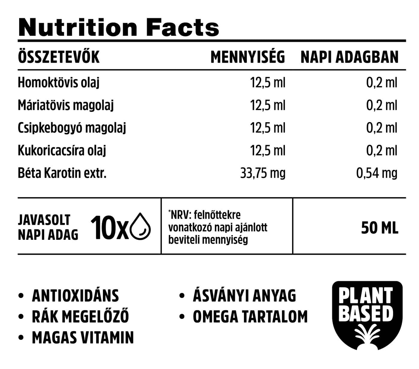 Homoktövis olaj, Csipkebogyó olaj, Máriatövis magolaj, Béta Karotin kivonat (Provitamin A), Kukoricacsíra olaj