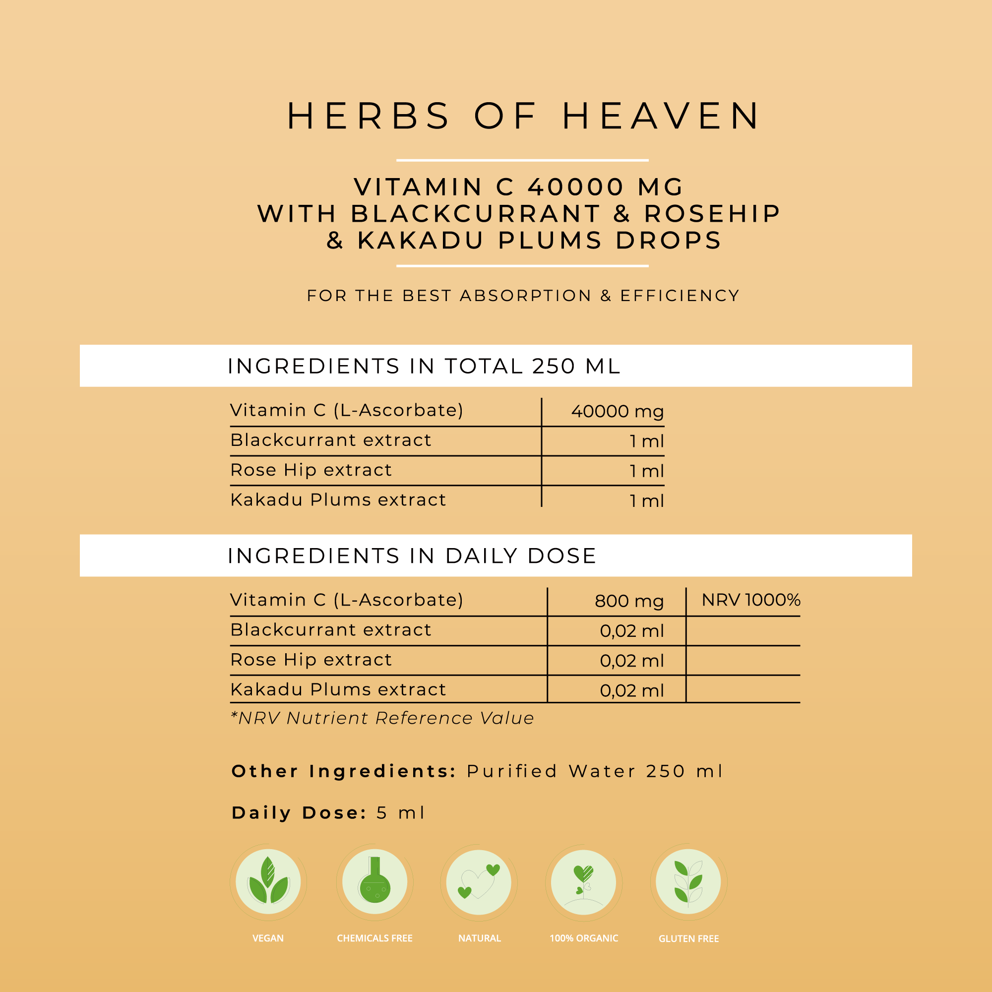 C-vitamin (L-aszkorbát), Feketeribizli kivonat, Csipkebogyó kivonat, Kakadu szilva kivonat, Egyéb összetevői: tisztított víz 250 ml