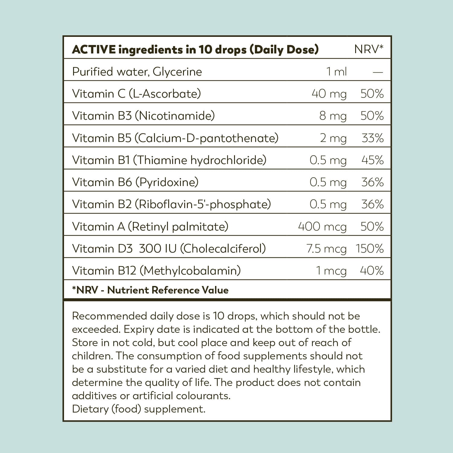 A Vitamin (Retinyl palmitate), B1 Vitamin (Thiamine HCL), B2 Vitamin (Riboflavin 5′-phosphate), B3 Vitamin (Nicotinic acid amine), B5 Vitamin (D-calcium pantothenate), B6 Vitamin (Pyridoxal 5′-phosphate), B12 Vitamin (Methylcobalamin), C-vitamin (L-ascorbate), D3 Vitamin (Cholecalciferol)