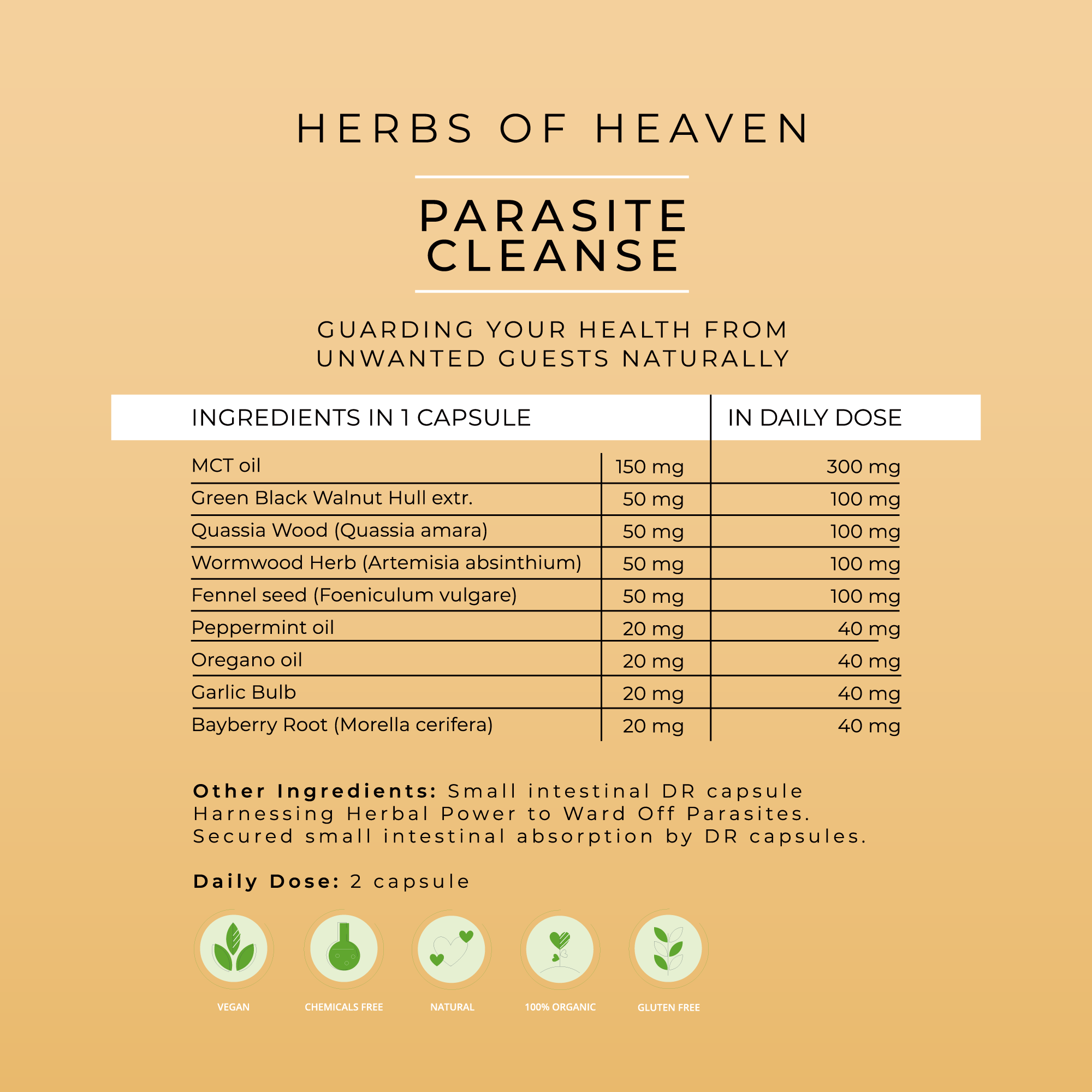 MCT olaj, Zöld fekete dió kivonat, Keserű kvasszia kivonat (Quassia amara), Fehér üröm kivonat (Artemisia absinthium), Édeskömény kivonat (Foeniculum vulgare), Borsmenta olaj, Oregano olaj, Fokhagyma kivonat, Viaszmirtusz kivonat (Morella cerifera), Egyéb összetevők: LICAPS olajkapszula a jobb felszívódásért